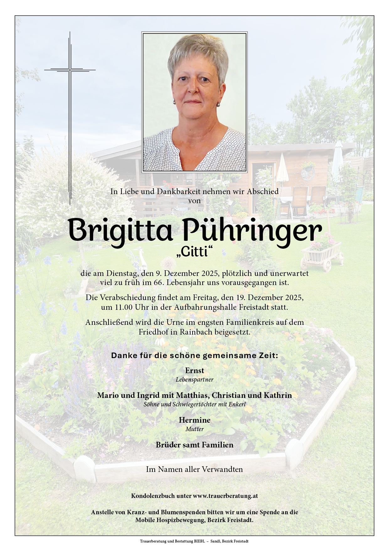 12. Dezember 2025 at 09:20Lieber Ernst und Trauerfamilie! Unsere aufrichtige Anteilnahme zum plötzlichen Tod von Gitti. Wir werden Gitti immer in liebevoller Erinnerung behalten, an Ihr Lachen und Ihren Humor. Vor allem aber an die Zeit , als Sie Wirtin im Stifterstüberl war und Ihren Beruf mit Liebe und Hingabe ausgeführt hat. Viel Kraft in dieser schweren Zeit. Verena und Rudi