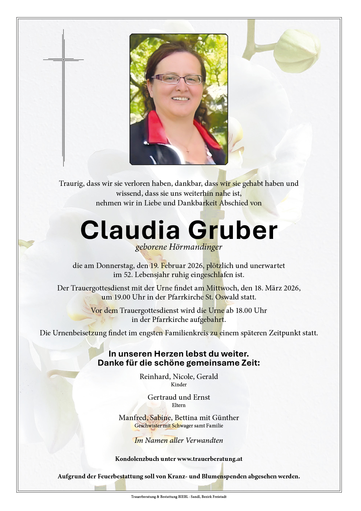 Anstatt Kranz- und Blumenspenden bittet die Familie um eine Spende an eine wohltätige Einrichtung.