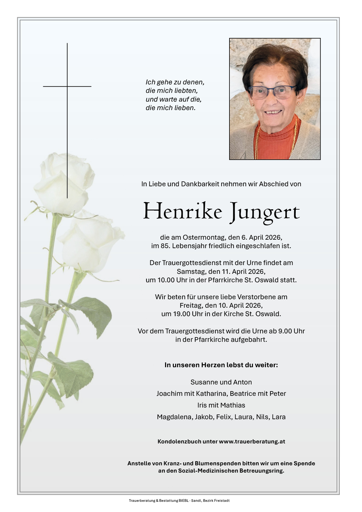 7. April 2026 at 14:26Frau Jungert war eine sehr präsente und besondere Bewohnerin in unserem Haus. Durch ihre offene und redselige Art fand sie schnell Zugang zu anderen Menschen und war sowohl bei den Bewohnerinnen und Bewohnern als auch bei allen Mitarbeiterinnen und Mitarbeitern bestens bekannt. Ihre Gespräche, ihr Interesse an ihrem Umfeld und ihre lebendige Persönlichkeit haben unseren Alltag bereichert.