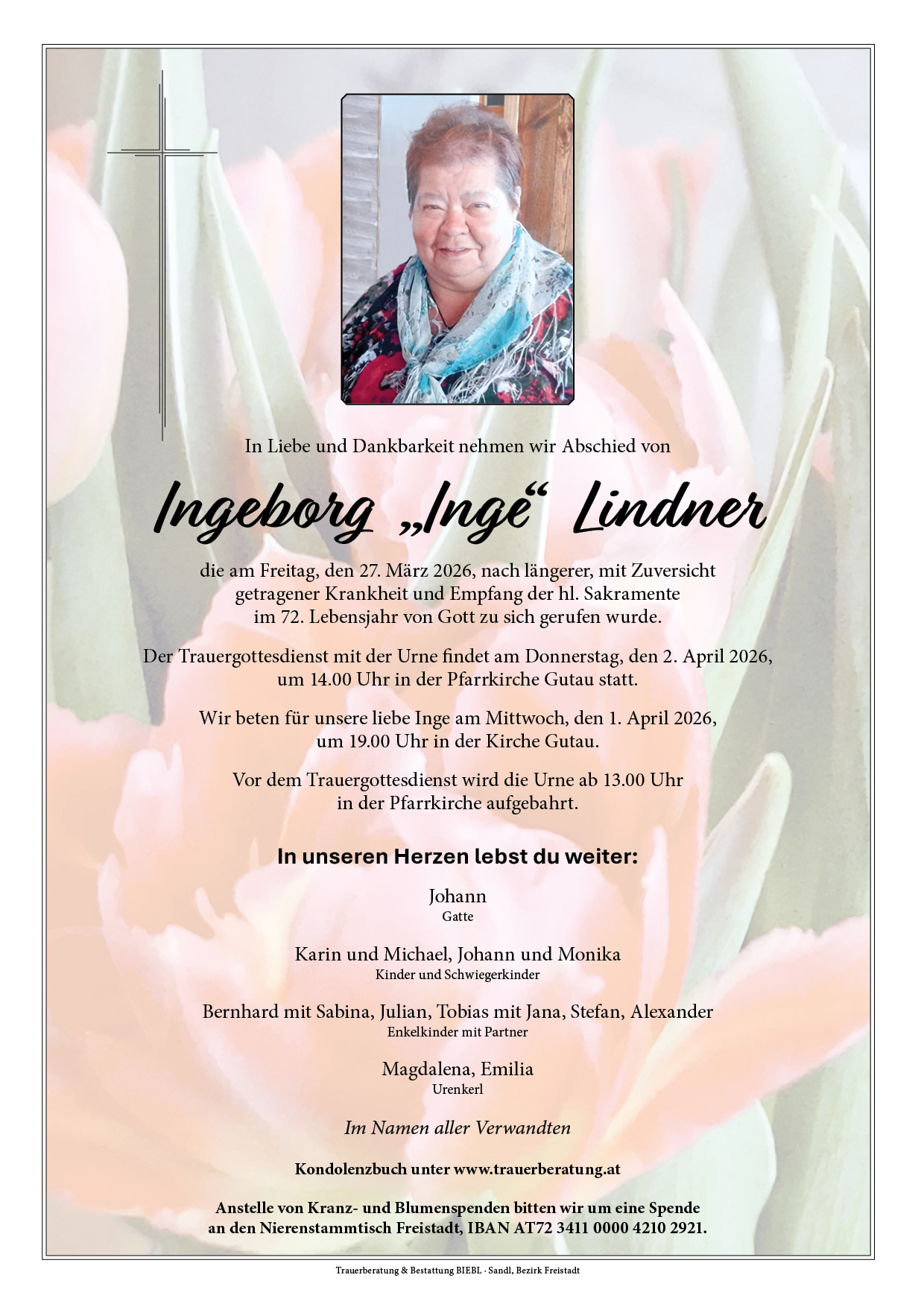 Der Trauergottesdienst mit der Urne findet am Donnerstag, den 2. April 2026,