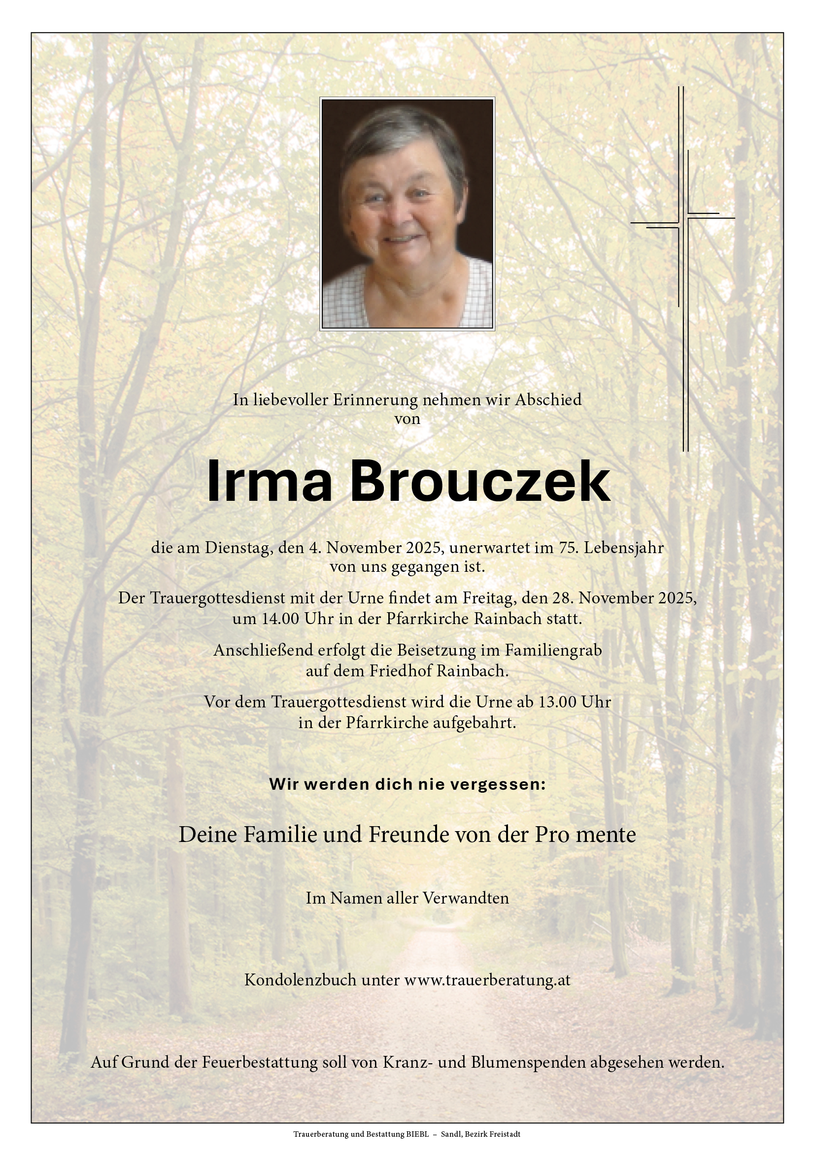 Der Trauergottesdienst mit der Urne findet am Freitag, den 28. November 2025, um 14.00 Uhr in der Pfarrkirche Rainbach statt.